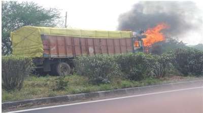 नेशनल हाईवे पर चल रहे ट्रक में भीषण आग, बाल-बाल बचे चालक और सहायक