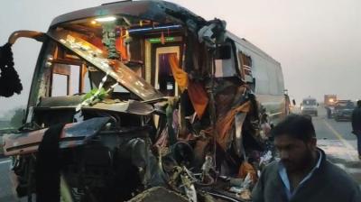 टूरिस्ट बस-डंपर टक्कर, खिड़की तोड़कर 57 को बचाया गया