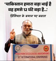 ब्यावर|राजस्थान में हुए एक कार्यक्रम के दौरान एक सरकारी कॉलेज के प्रिंसिपल ने ऐसा कुछ कह दिया कि जिस पर बवाल हो गया है। उनका कहना है कि पाकिस्तान हमसे 12 घंटे बड़ा है और इस नाते वह हमारा बड़ा भाई है। इतना ही नहीं उन्होंने कहा कि जब हम आजाद हुए थे तो देश में तीन ही नेता थे, गांधी, जिन्ना और अंबेडकर, केवल ये तीन नेता ही लोकप्रिय थे, इनमें नेहरू का नाम नहीं था।यह बात अजमेर के सम्राट पृथ्वीराज चौहान राजकीय महाविद्यालय के प्रिंसिपल मनोज बेहरवाल ने ब्यावर के एक कॉलेज में आयोजित एक कार्यक्रम के दौरान कही। दरअसल 23 और 24 जनवरी को यहां के सनातन धर्म राजकीय महाविद्यालय में राजस्थान सोशियोलॉजिकल एसोसिएशन की 31वीं इंटरनेशनल कॉन्फ्रेंस हुई थी। इसी दौरान 24 जनवरी को बेहरवाल ने ये सारी बातें कहीं।