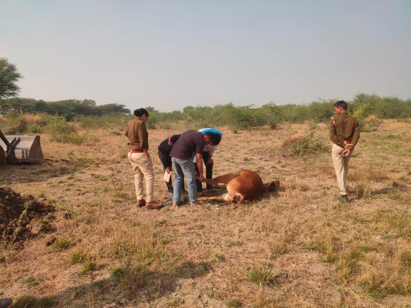 पुलिस ने पांव के टुकड़ों को भी कब्जे में लेकर पशु चिकित्सालय सज्जनगढ़ में पोस्टमार्टम कराया। चिकित्सकों ने खाल और पांव को गोवंश का बताया, लेकिन यह स्पष्ट नहीं हो सका कि पांव गाय के थे या बैल के। बाद में गोशाला सज्जनगढ़ के सहयोग से खाल और पांव का अंतिम संस्कार किया गया।