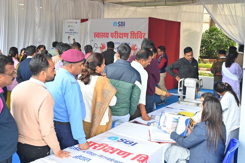 भोपाल। देश के सार्वजनिक क्षेत्र के सबसे बढे बैंक भारतीय स्टेट बैंक ने स्थानीय प्रधान कार्यालय में आज कर्मचारियों के स्वास्थ्य, ऊर्जा और कार्यक्षमता को सुदृढ़ बनाने के उद्देश्य से कॉरपोरेट एम्पलाई इंगेजमेंट के तहत एक भव्य हेल्थ अवेयरनेस कैंप का सफल आयोजन किया गया। कार्यक्रम का शुभारंभ सर्किल के मुखिया मुख्य महाप्रबंधक श्री प्रभाष कुमार सुबुद्धि, महाप्रबंधक-2 श्री ओंकारनाथ चौधरी, महाप्रबंधक-3 श्री मनोज कुमार तथा डीजीएम एवं सीडीओ श्री मनीष मठपाल द्वारा स्वयं का हेल्थ चेकअप करवाकर औपचारिक उद्घाटन किया गया। इस अवसर पर स्थानीय प्रधान कार्यालय के अधिकारी एवं कर्मचारी बड़ी संख्या में उपस्थित रहे और पूरे उत्साह व अनुशासन के साथ कार्यक्रम में भाग लिया। शिविर के अंतर्गत ब्लड प्रेशर, शुगर, ईसीजी, नेत्र परीक्षण सहित विभिन्न स्वास्थ्य जांच की गई तथा अनुभवी चिकित्सकों द्वारा व्यक्तिगत परामर्श भी प्रदान किया गया।